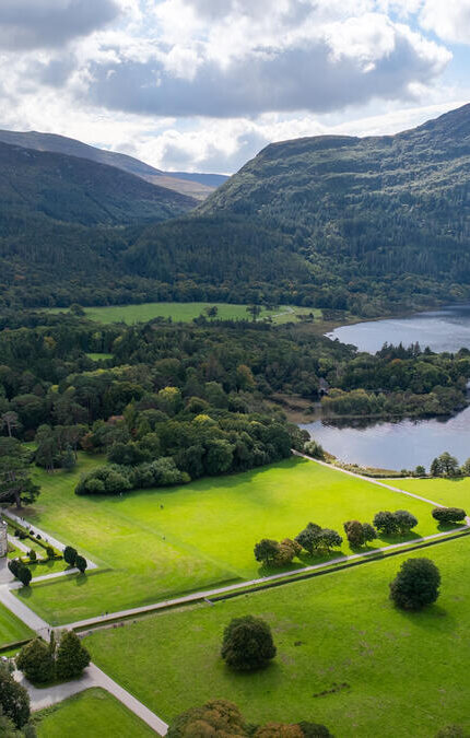 A calm lake stretches between two forested hills under a partly cloudy sky, with distant mountains visible in the background.A large house with a grey roof sits in the background, surrounded by well-kept gardens with colourful flowers and shrubs under a partly cloudy sky.Upper Lough, Killarney Co. Kerry.